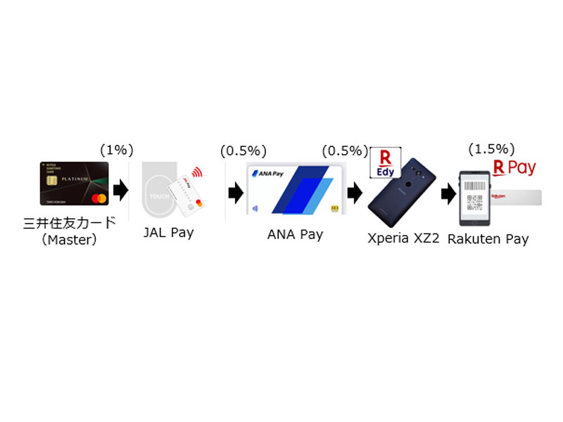 三井住友カードからジャルペイにチャージ(1㌫)したのち、ジャルペイからアップルペイを介してアナペイにチャージ(0.5㌫)します。ここから、最終的な決済の各種インタフェースに流してゆくわけです。最近、楽天ギフトカードが改悪されまして、筆者の場合、ずいぶん昔に使っていたSONY XPERIA SZ-2 COMPACTを活用して、アナペイから楽天ペイアプリ(アンドロイド)にクレジットカード番号を登録しておき、楽天エディ(スマホ搭載)に流して(0.5㌫)、そこから楽天残高に再度移動させます。ここでの残高は、楽天証券でのつみたて投信の買い付け資金専用で使ってきました。一方で、何を見直したかというと、この残高を使って楽天ペイを使えば、1.5㌫還元されるというこに気がつきました(合計で3.5㌫還元)。楽天ギフトを介していたので、その手間を考えて避けていたのですが、自宅の手元のスマホ操作だけでルート上を流すことができますので、今後はうまく活用したいと考えます。ためしに楽天ペイにて11,230円を決済したところ、楽天ペイ利用分として112㌽、楽天キャッシュ利用分として56㌽が獲得予定となりました。ざっくりと、決済金額に対して1.5㌫還元が確認できましたので、今後は活用したいですね(㋿7年12月12日追記)。