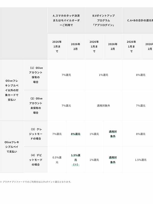 三井住友カードのオリーブフレキシブルペイ(クレジット)を使うと、従前の7 ㌫から8 ㌫に還元率が改善されるようです。ただし、これにはからくりがありまして、アプリログインで1 ㌫が上乗せされていたものが廃止されることになります。従って、2月については、これまで通り、三井住友カードを使えば良いわけで、7 ㌫とアプリログインの1 ㌫にて、合計8 ㌫になります。一方で、3月以降については、三井住友カードであれば、アプリログインの1 ㌫が上乗せされず、還元率が7 ㌫に改悪されますので、オリーブフレキシブルベイを使う方が良いわけです。すでにアップルペイに登録しておきましたので、3月以降はそちらを使おうかと思います。正直なところ、請求がばらつくのが難点ですが、還元率を高めるためには、管理できる範囲内で仕方がないとあきらめることにします。筆者の場合は、基本還元率(8 ㌫)、選べる特典(1 ㌫)、外貨積立(1 ㌫)で、これまで通り、合計10 ㌫ということになります。