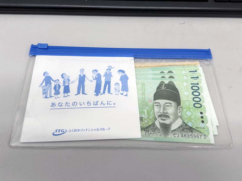 福岡銀行の外貨両替サービスを利用して韓国ウォンを両替しました。インターネットで予約した後、3営業日以降に指定した銀行支店での受取が可能となります。外貨はパック販売(10,000㌆×5、50,000㌆×1)となり、100,000㌆を11,780円で両替しました。ちなみに、予約時の為替レートと比べて円高方向に振れたため少しお得でした。福岡銀行の為替レートは849㌆/100円で、ワオパスは917㌆/100円なので、一般的に言われている通り、マイナー通貨の両替は日本では不利でした。一方で、現実的に必要となる一万円程度の両替であれば、800円程度を追加するだけで、最寄りの福岡銀行の支店で安心安全に両替できると考えれば十分に許容できると感じました。ところで、窓口のお姉さんが、前回はスペインで欧ユーロでしたね、次は韓国ですか?と覚えてくれていました。