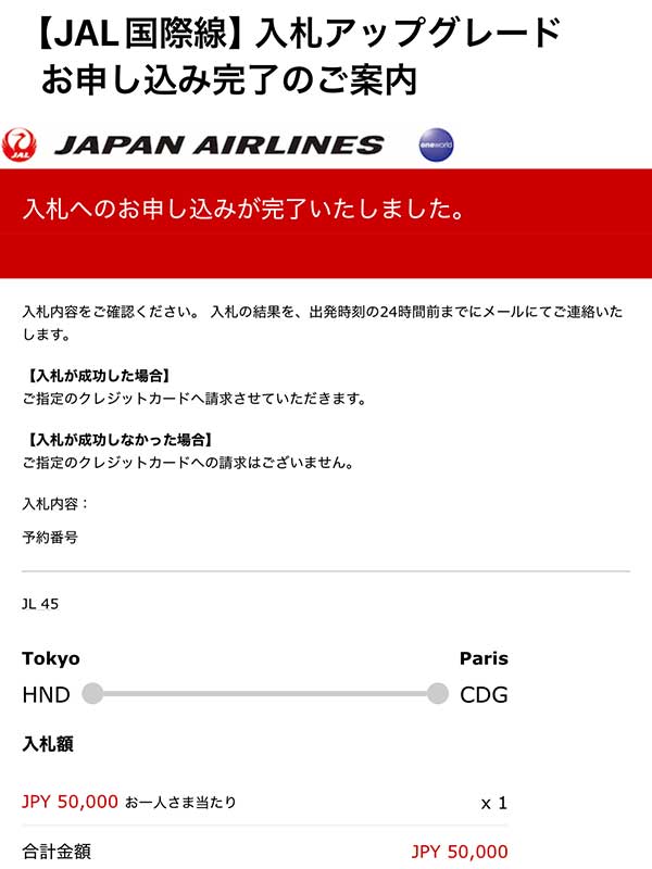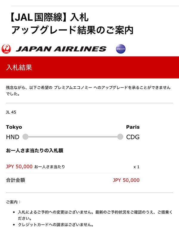 今度のフランス移動に際して、往路の東京(羽田空港)~パリ(CDG空港)の区間に対して、エコノミークラスから上位クラスへの入札アップグレードのオファーが届きました。先日、ハワイ路線を利用したとき、復路の国際線に対して、入札アップグレードに応募して当選しました。エコノミークラスからであれば、プレミアムエコノミーまたはビジネスクラスへのアップグレードになります。当選確率は入札額によって決まるということになりまして、プレミアムエコノミーにおいては、標準入札金額は75,000円となります。今回の移動区間においては、往路の東京(羽田空港)~パリ(CDG空港)の区間の所要時間は14時間30分となりまして、最長になりますので、50,000円のミニマムベッドで応募しました。先日のハワイ路線においては、復路のホノルル空港~東京(羽田空港)の区間において、9時間のフライトに対し、30,000円(ミニマムベッド当選)でしたので、3,330円/時間の課金になります。今回は、往路の東京(羽田空港)~パリ(CDG空港)の区間において、14時間30分のフライトに対し、50,000円(ミニマムベッド)なので、3,448円/時間の課金になります。体力など総合的に勘案してエコノミークラスでも大丈夫ですが、こういう遊び心も悪くないかなと思います。
