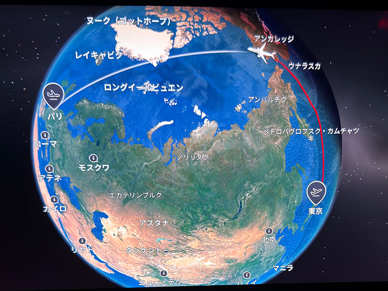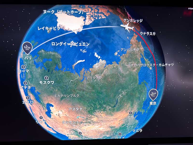 飛行機に乗るとあとは覚悟です。というのも、欧州方面のフライトはロシアを迂回するので、アメリカのアラスカ方面に向かい、そのあと北極海を通って欧州に行きます。そのため、これから14.5時間の長旅となり、フライト時間が絶望的に長いです。かつて冷戦下では、欧州行きはアンカレッジ経由だったようですが、最近の飛行機の性能が改良され、途中給油無しで大丈夫なのでしょう。エコノミークラスの座席は、3列・3列・3列なので、ハワイ路線と比べてゆとりのある作りになっているように感じました。プレミアウムエコノミーは、ちょっと広めでして、このちょっとに5万円以上の価値を見いだせるかという問題でしょう。ビジネスクラスは快適そうですが、空飛ぶネットカフェに課金できるかという問題になりますね。とくに私費で移動するならまだしも、お仕事の出張のため研究費を使っているので、エコノミークラスで十分です。正直なところ座席もそこまでひどくないというか、悲しいかな長距離フライトに慣れすぎて適応したのかもしれません。また、今回は昼間便なので、体の負荷は深夜便の比ではないくらい小さいです。JALの個人用画面が大きくなっていまして、スマホと連携できるようでした。商用電源が使えるようで、どのようなプラグ形状にも対応するコンセント形状でした。北回りルートであるため、北極圏の周辺はインテルサット衛星の通信圏外なので、機内Wi-Fiサービスの利用は限定的です。具体的には、パリに到着する3時間前くらいに接続して、スマホでメールの送受信とテキストベースの軽いウェブサイト閲覧であれば大丈夫ですが、それ以外はムリでした。1時間の無料プランが付与されますが、着陸2時間前に食事が提供されるのと合わせて考えると、オフラインで作業をすすめることを前提とするのが良さそうです。
