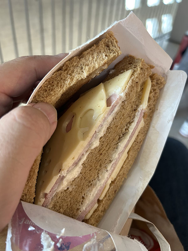 福岡空港にて、パリで一度荷物をピックアップせよと言われたので、パリCDGで入国しました。入国審査は長蛇の列ができていまして、30分ほどかかりました。しかし、ターンテーブルには荷物が流れてきませんでした。おそらく、キョロキョロしていたのでしょう、JALの係員の方が話しかけてきてくれました。事情を説明して確認してもらうと、ニース空港までスルーとのことでした。福岡空港で、パリでピックアップせよと言われた際に、ニース空港までスルーでは?と聞き直してもなお同じ応答でした。腑に落ちないところはありましたが案内通りに対処したのですが、やはり単純な案内ミスでした。人なのでミスはありますし、それを責めても仕方がないし、こちらとしてもクレームをいうつもりもありません。むしろ、やはりそうだよねと納得できましたし、迷惑ついでにターミナルの場所も教えてもらいました。ここで、再度セキュリティを抜けて制限エリアに入りました。液体物のチェックが厳しくて、液体を持っていないかしつこく聞かれました。どうやら、香水を持ち歩いているとみられたのでしょう、香水を持っているでしょと言われまして、さすがフランスと感心しました。日本を出発してほぼ24時間、まともな食事をしていませんでしたので、コンビニでサンドイッチと水を買いました。ターミナルのラウンジを調べたのですが、最寄りにはなかったので、素直に搭乗ゲート近くの待合スペースで待機しました。