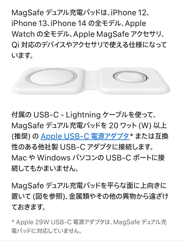 愛用しているMagSafeデュアルパットの動きに違和感がありました。というのも、Apple Watchを充電中にiPhoneをかざすと、なぜか充電が止まります。逆もしかりで、iPhoneが充電できていることを確認したうえで、Apple Watchを置くと充電がはじまりません。これは壊れたと薄々感じながらも、Apple公式製品のために、案外値が張るので捨てられないでいました。いい加減に諦めて処分しようかと思ったとき、ふと製品ページをみると、米印の小さな文字で「29Wの充電器は非対応」となっていました。おもむろに給電に使っていたアダプタを確認すると、ピンポイントでそれでした。そこで、給電能力は落ちてしまいますが、手元にあった20Wのアダプタに置き換えると、問題無く、同時に充電ができるようになりました。こういうこともあるものかと思いつつ、とりあえず色々と良かったです。