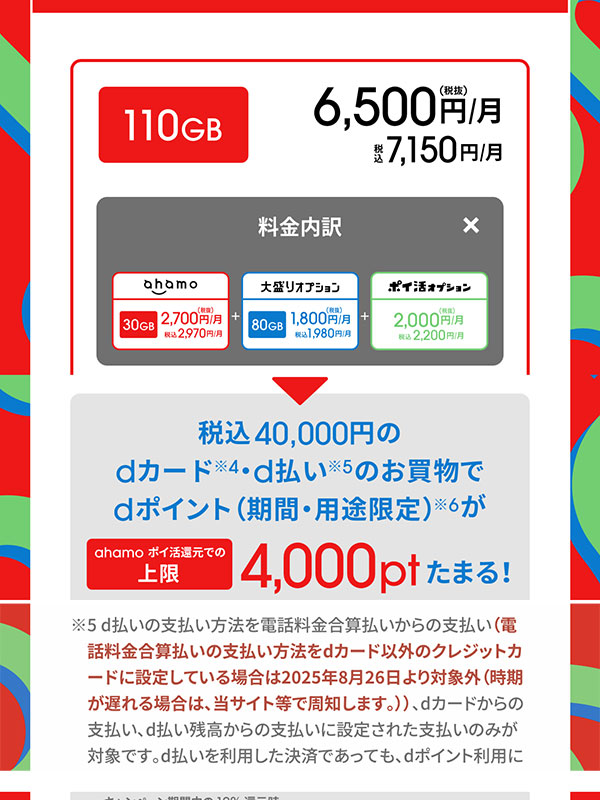 メインスマホ(iPhone 14)は、ドコモ・アハモを使っていまして、通常プラン(30㌐)で利用しています。とくに不自由はなかったのですが、やはり、意識してデータ通信を削減しなくてはならないのが面倒くさいと感じていました。そこで、大容量プラン(80㌐上乗せ)を申込むことにしました。あわせて、ポイ活オプションを申込んでおくと、d払いにて4万円決済するとき、4,000㌽が付与されるため、実質的に通常プランと同じ価格で、110㌐/カ月を利用することができます。ポイ活オプションについては、気をつけなければならないことがありまして、㋿7年8月26日以降は、電気料金合算払い(アメックス)にて、d払い決済をするとポイント付与対象外となります。そこで、今後の戦略としては、8月の中旬頃までに4万円のノルマをクリアしておき、9月以降については、d払い残高に4万円を入金(現金)しようと思います。最近はスマホは生活必需品かと思いまして、社会生活を営むうえで、スマホが前提となった仕組みであることが多いように思います。そのような中で、ギガを意識せずに使えることはありがたいです。