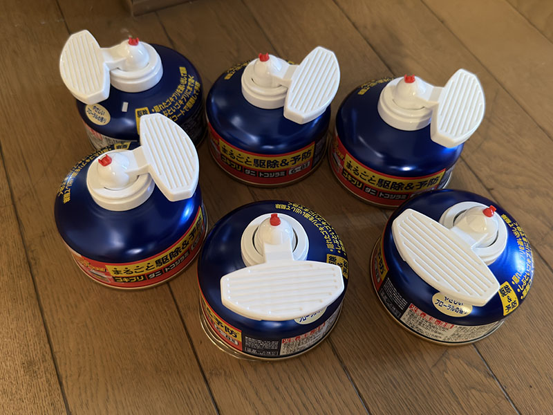 年に1度のバルサンを炊きました。いつも、水や火を使わないノンスモーク霧タイプを使っていますので、準備や後片付けが比較的楽です。午前中に炊くと、空気の入れ替えの時間帯が昼間になりまして、それではエアコンなしでは厳しいので、今回は、夕方に炊き始め、空気の入れ替えが少し涼しくなる夕方になるようにしました。1時間で大丈夫とありますが、2時間ほど燻しておきました。煙や水のタイプと比べて、霧タイプは効果が弱いとされていますが、それはあまり気にならなず、防虫効果を感じています。数量としては、3個入りを2組み、合計6個を炊きました。