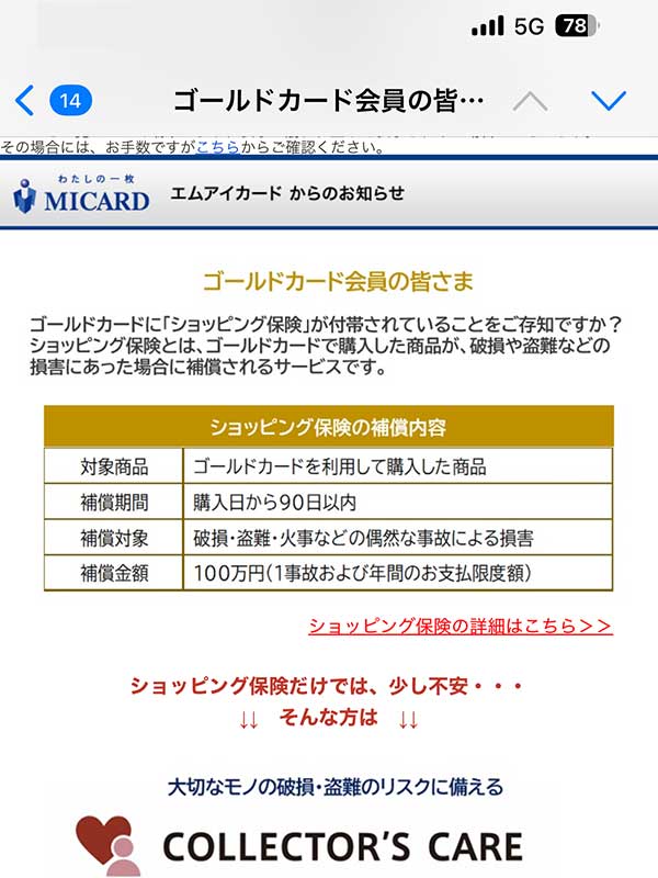これまであまり意識していなかったのですが、手元のエムアイカードにはショッピング保険が付帯していたようです。基本スペックとして、購入日から90日&100万円を限度額としていますので、なかなかのものです。ちなみに、追加の保険を申し込むと、この期間を延長できるようですが、そういう性質の商品を購入するのであれば、アメックスカードを使いますので、標準の保険で十分かと思いました。ちなみに、アメックスカードは、ショッピング保険の期間が1ヵ年に延長される追加保険に加入しています。具体的には、年間補償限度額:200万円、自己負担額:1事故につき10,000円、年間保険料(一括払):5,000円でした。