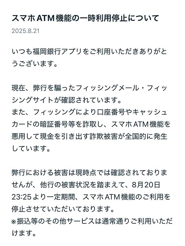 1]にて述べたことになるのですが、手元のアレコレカードの磁気が壊れており、カードの再発行が必要となっていました。キャッシュカード単体であれば、カードの磁気だけを入れ直してもらえば良いのですが、一体型の場合は、問答無用で再発行になるようで面倒くさいところです。また、このカードには交通ICカードであるnimocaが搭載されていますので、旧カードから新カードにデータを移行する手続きが必要になります。手続きが可能な場所としては、天神、博多、西新の西鉄カウンターに立ち寄る必要があります。ところで、カードが無事に届いて安堵しているところもあります。というのも、カードが届くまでの間、スマホのQRコードによる入出金を考えていたのですが、セキュリティの観点でサービスが停止しているようです。