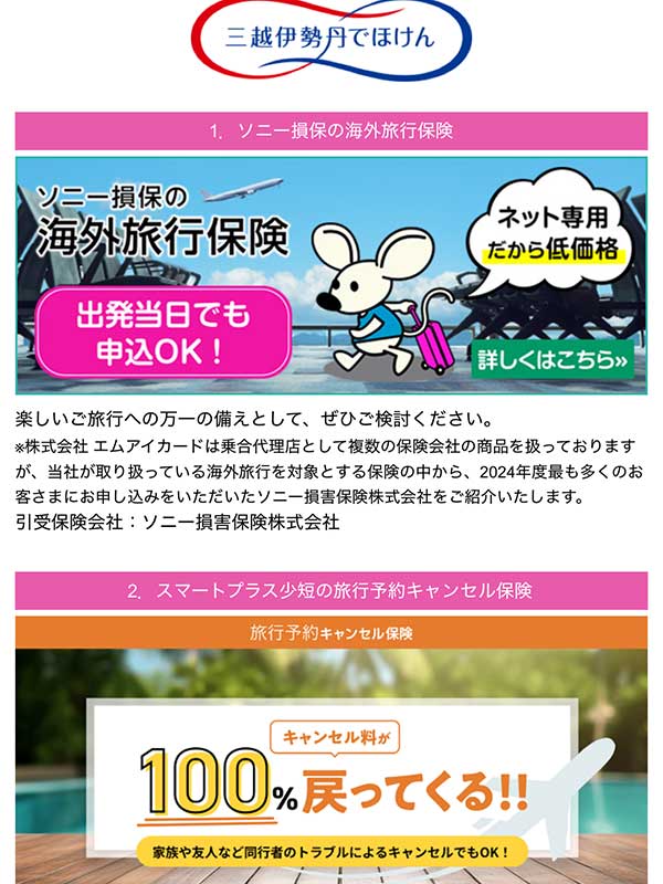 エムアイカードから広告メールが入り、お勧めの保険商品というのが紹介されていました。その中には海外旅行保険もありましたので、試しに来週の韓国旅行の日程で見積もりを出したてみました。このとき、思ったよりも条件が良くて、私がいつも愛用している損保ジャパンの海外オフの保険よりも割安であることに気が付きました。掛け捨て保険の保険料は安価な方が助かります。まだ、出発まで時間がありますので、今回は、損保ジャパンの保険をキャンセルしたうえで、そちらの方に加入することにしました。ソニー保険の海外保険でして、エムアイカードからのご紹介という枠になります。バラ掛けも可能でして、治療費用として5,000万円だけという選択も可能でした。